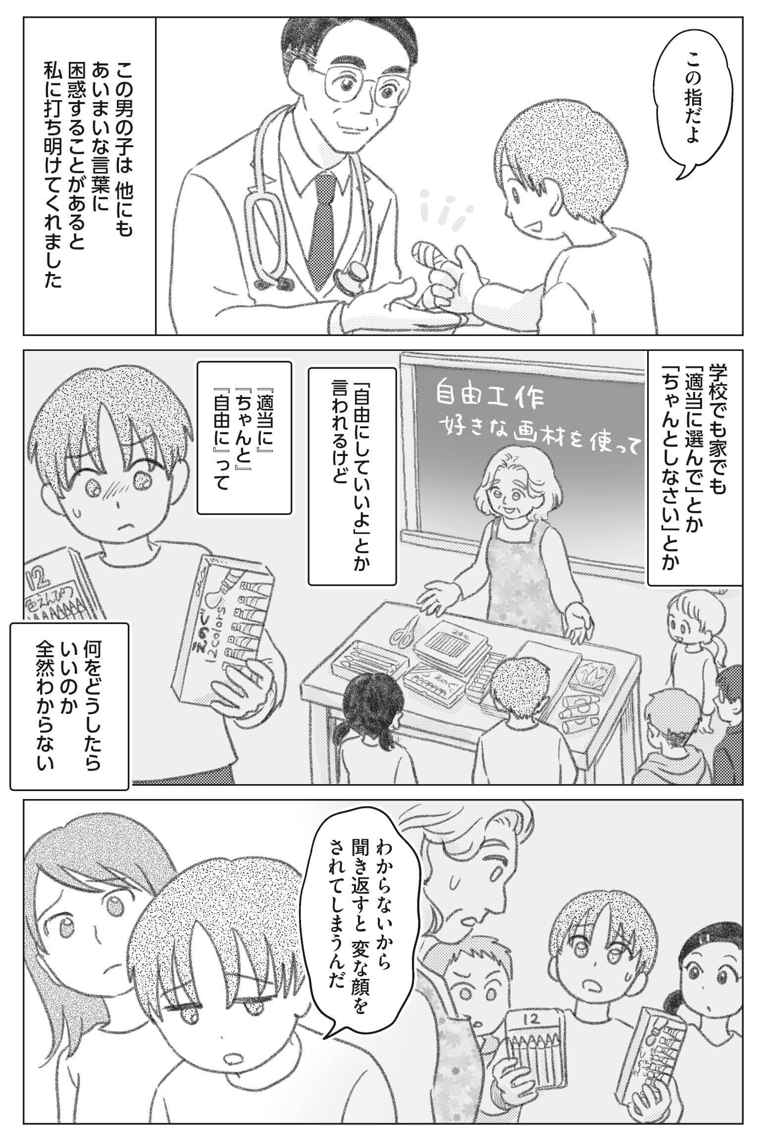 他にも、診察でASDの方に「最近いかがですか?」と聞くと、「何が?」と聞き返されてしまうことがあります。「適当に」「ちゃんと」「自由に」といった言葉も混乱させてしまいがちです。
