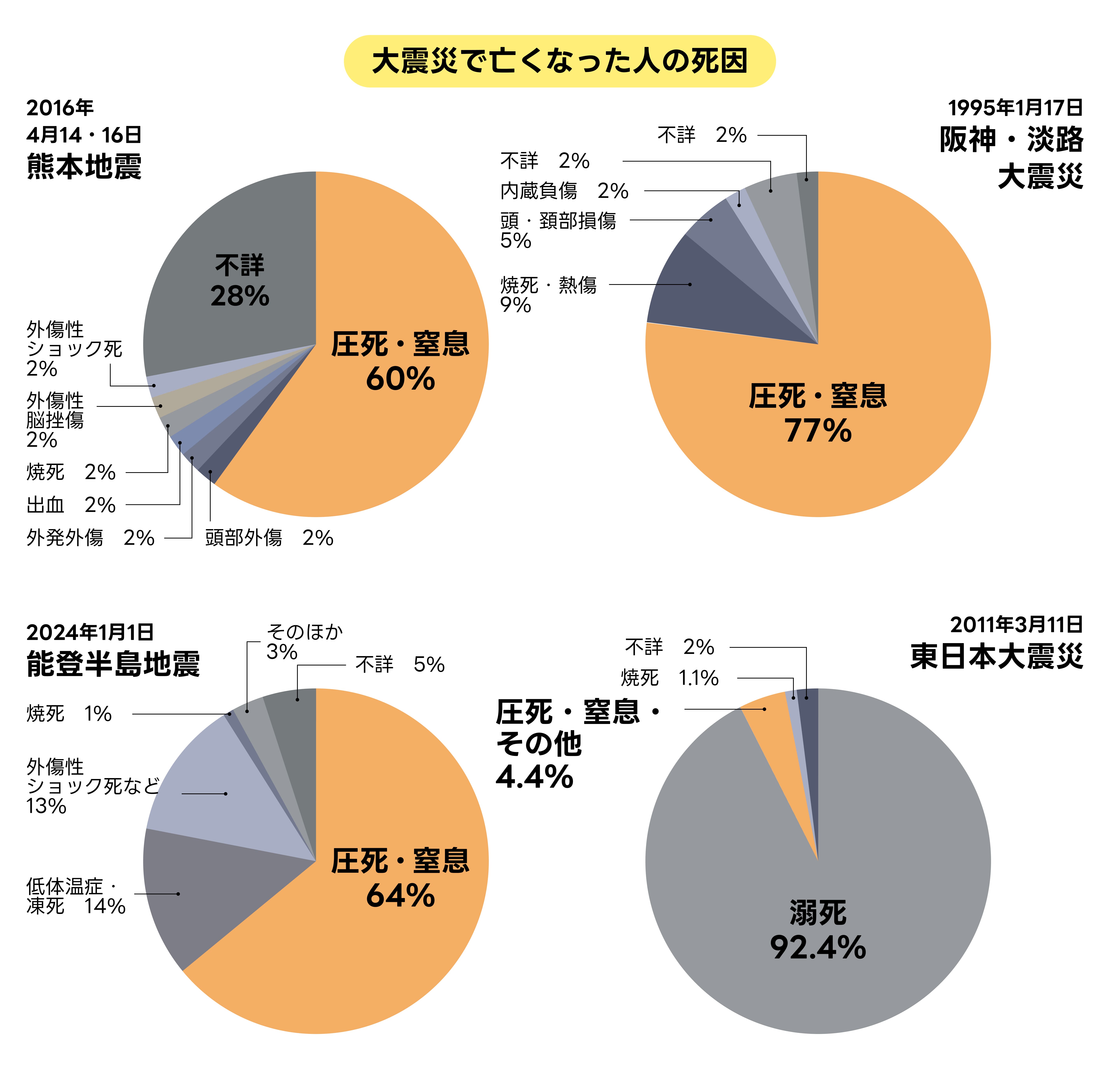 一方、阪神・淡路大震災や熊本地震のような、日本の陸地で発生した大規模地震の死因の多くが「圧死・窒息死」です。