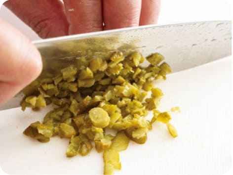 ピクルスは、包丁を横にしてのせておしつぶしてから、みじん切りにする。
