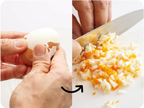 氷水に入れて冷やしてから、からをむく。みじん切りにする。