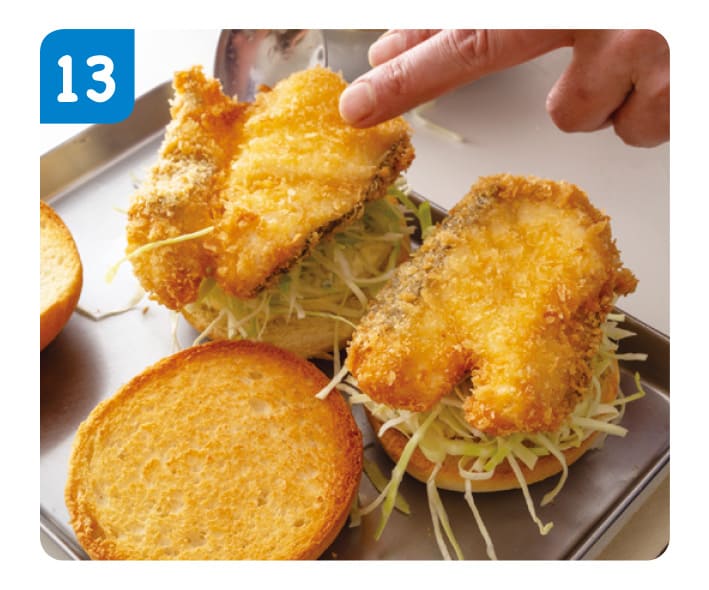 たらは2つに切って合わせて、バンズにはさみやすい形にととのえるよ。