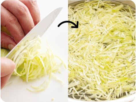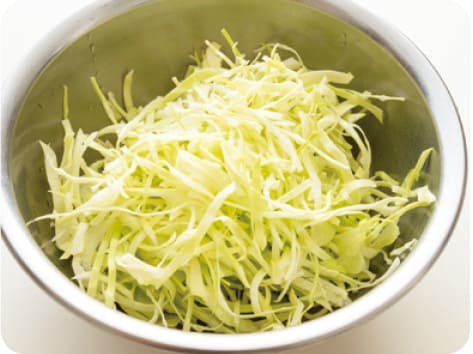 キャベツはせん切りにする。水に5分ぐらいつけておく。