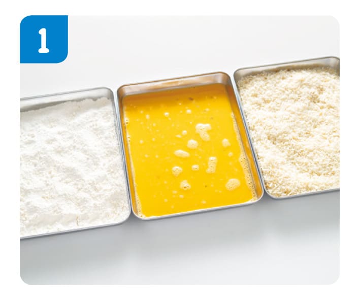 たまごはさいばしでといて、バットに入れる。小麦粉とパン粉も別々のバットに入れておく。