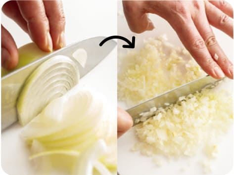 玉ねぎは、薄切りにしてから、できるだけ細かいみじん切りにする。