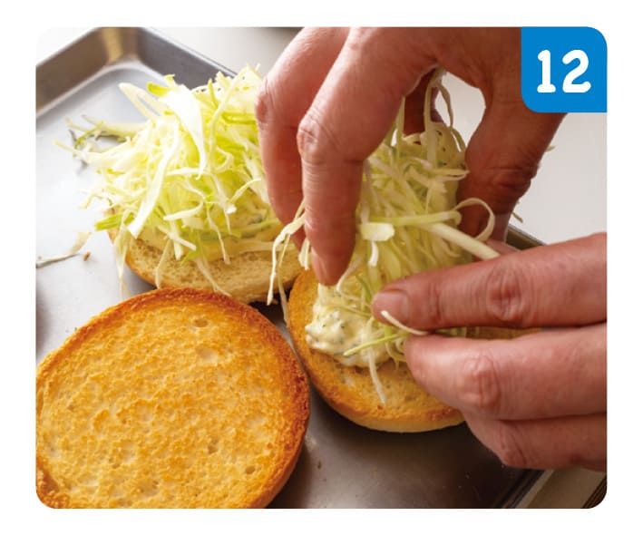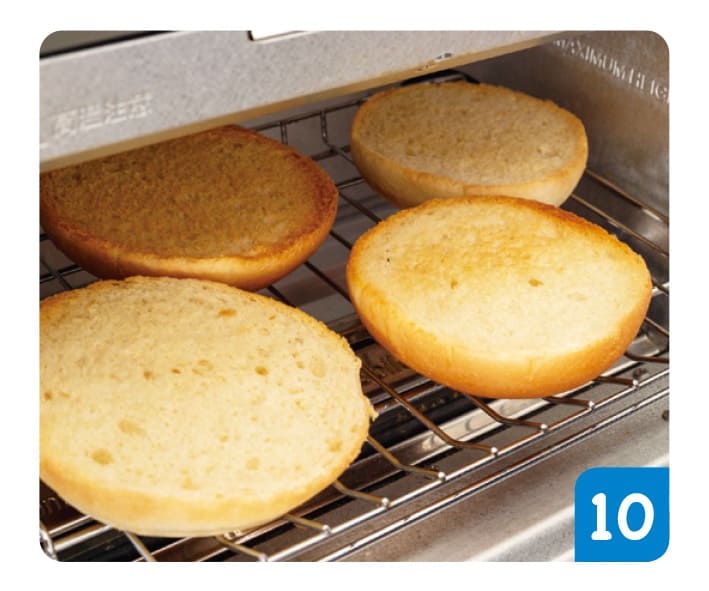 バンズを横半分に切る。切り口を上にして、薄く焼き色がつくまでトースターで軽く焼く。