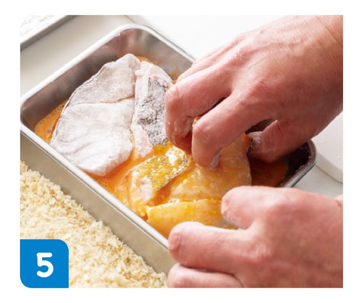4をたまごに入れて、できるだけバラバラにならないようにしながら、全体にたまごをつける。