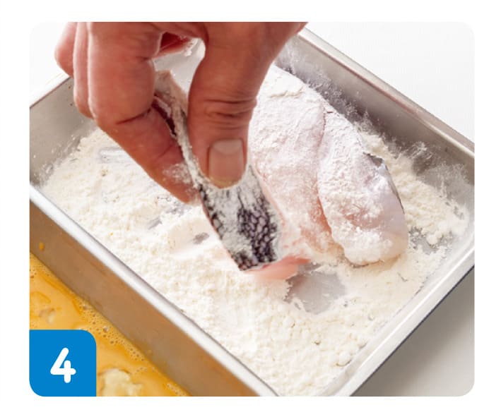 3のたらに、白コショウを少しふる。小麦粉のバットに入れて、薄くまぶす。