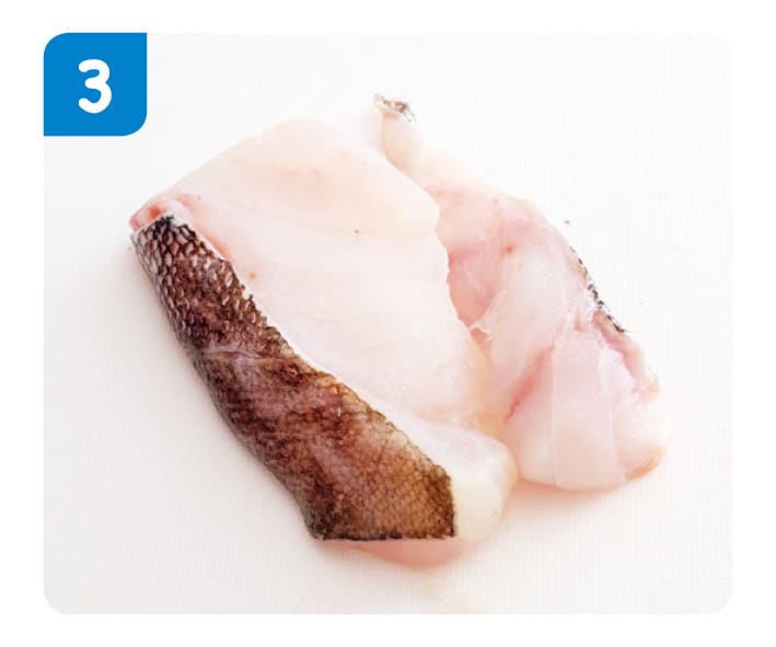 2のたらを半分に切る。切った2つを合わせて、四角に近い形になるように、ととのえる。
