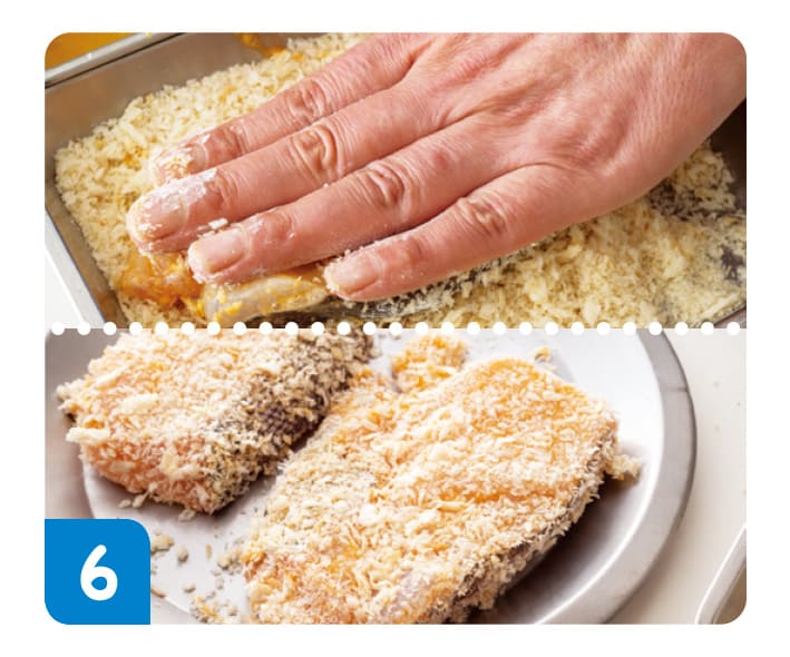 5をパン粉の上にのせる。まわりのパン粉をかけて、手でおさえてパン粉をつける。